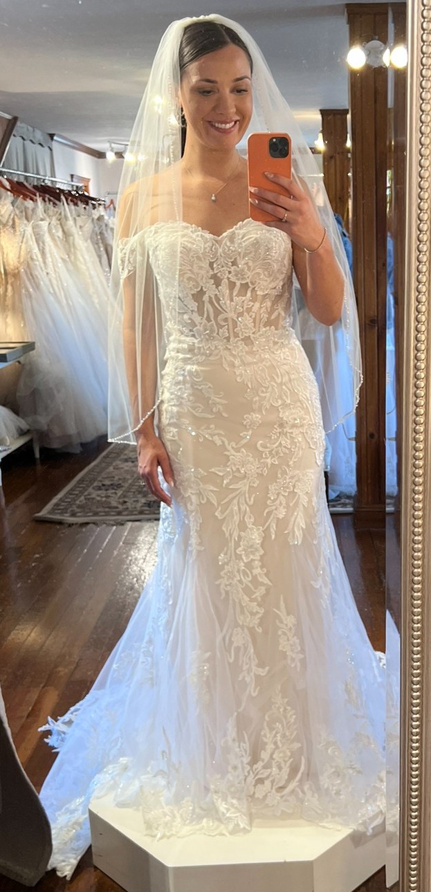 I bought the dress, took it to alterations, & never ended up wearing it. The only alterations made were the cups that were added. It's been in my closet in the dress bag ever since. The straps seen in photo were never added. The detachable long sleeves come with the dress.