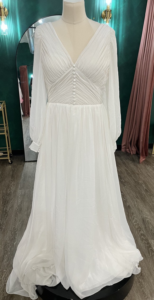 Beaded front, soft A-line, chiffon gown with billowy sleeves.