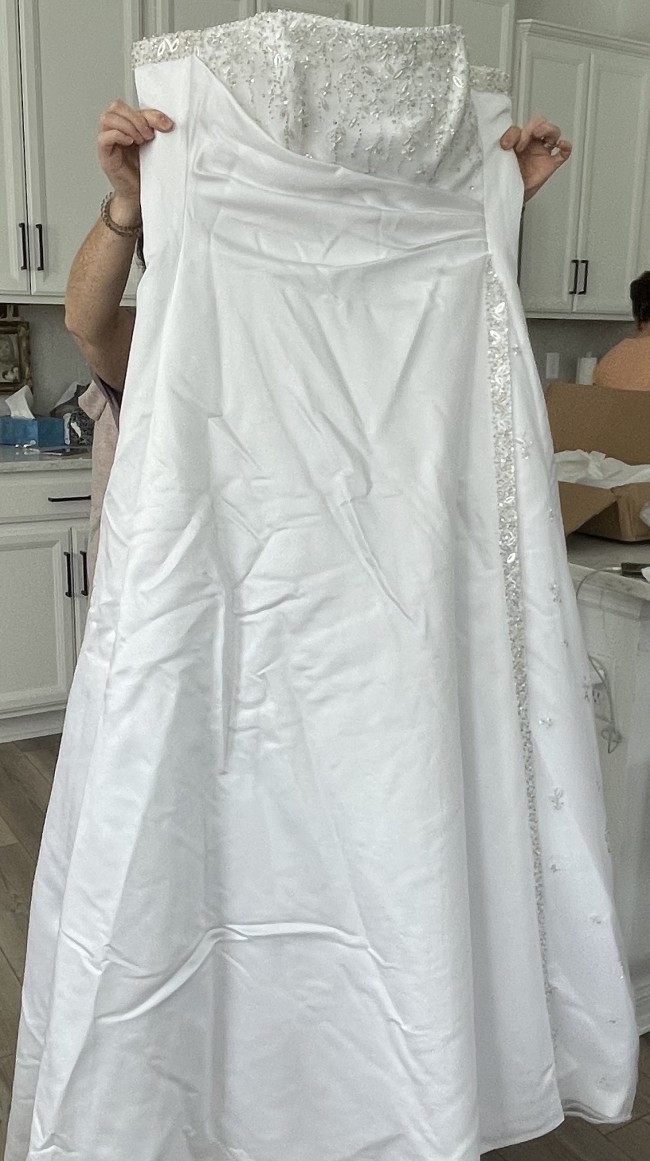 Never worn 2004 Maggie Sottero Dion strapless Wedding dress with matching veil, shawl and clutch. Has been stored in a garment bag and in excellent new condition. Tag says standard size 14 but it is more like a retail size 4.