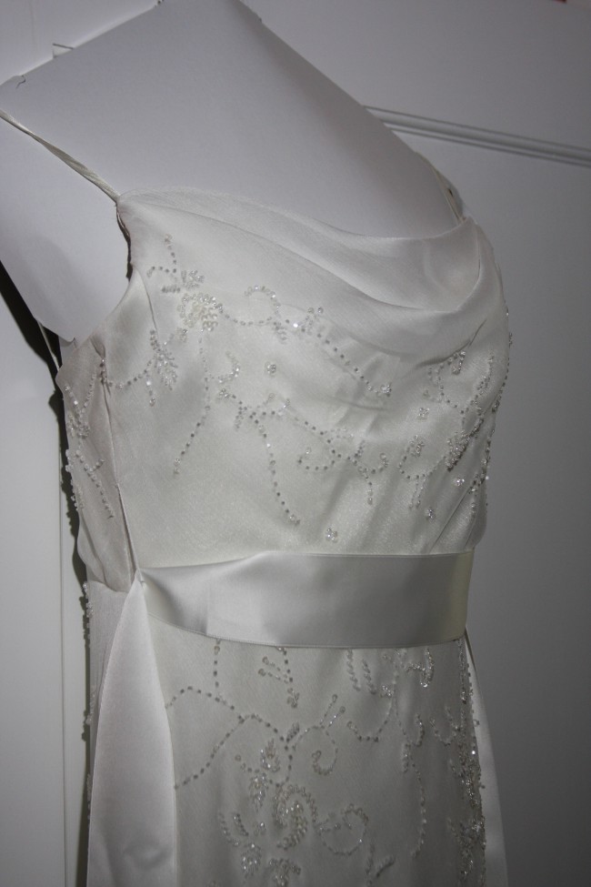 2009 Wtoo ivory sheath dress with crystal beading, soft cowl neck line, and bow in back. Worn once, dry cleaned and preserved. Very comfortable, flowy, and easy to dance in. Soft romantic feel.