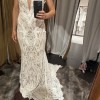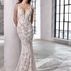 This slinky, sexy sheath gown features a bold and luxurious chiffon laser-cut embroidered floral and linear lace paired beautifully with a cotton lace leaf motif and subtly shimmering underlayer. The nude illusion bateau neckline melts away to create a unique, dimensional neckline complementing the low illusion back and extravagant lace train. FELICITY is perfect for our brides searching for a gorgeously relaxed yet fashion-forward look.