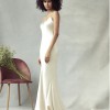 Signature style silky, champagne bias cut V neck slip dress. Skirt is elegantly cut with side godet detailing to give further volume to dramatic train.