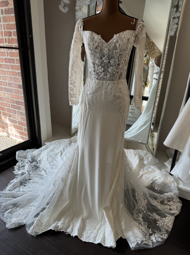 TARAJA - Crepe fit and flare featuring sweetheart off the shoulder neckline with long sleeves. Sheer bodice embellished with sequined lace appliques that cascade down hips, detail hem, and create a cutout 108in / 274 cm cathedral length train. Finished with crepe covered buttons on back bodice, jersey lining, and tulle godets at sides of skirt.