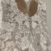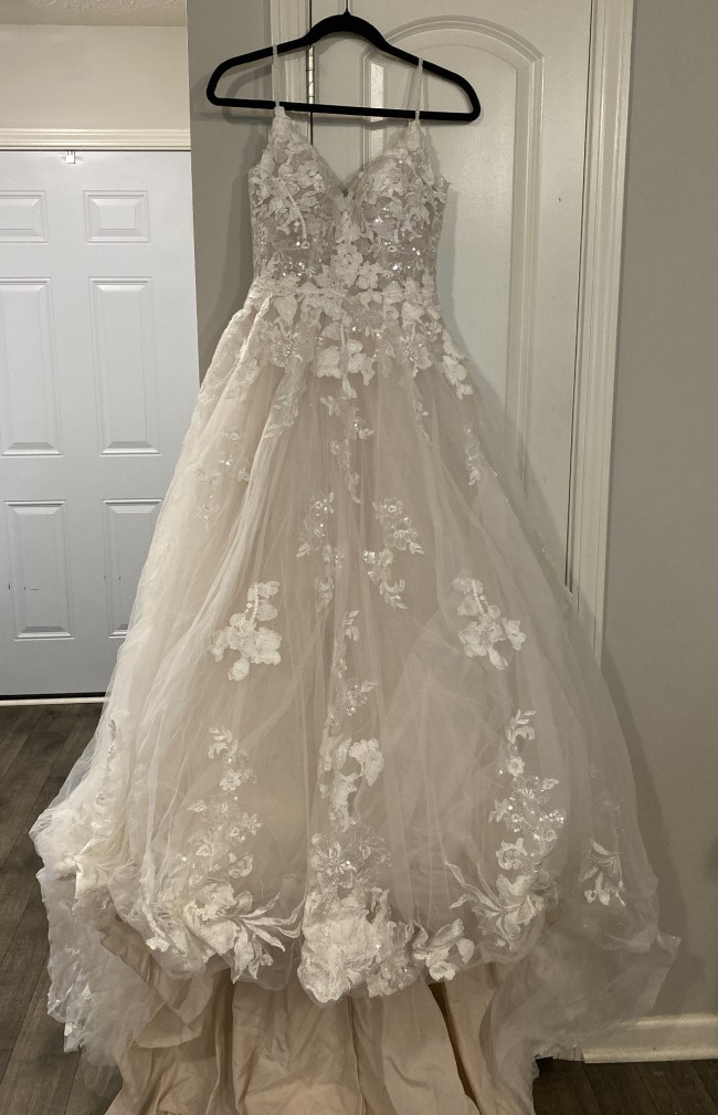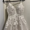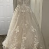 Beaded and floral wedding ball gown that is elegantly crafted. Floral appliqués are delicately arranged and create a beautiful and fairytale silhouette. This dress style, worn only twice, remains in near-pristine condition.