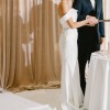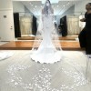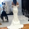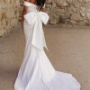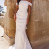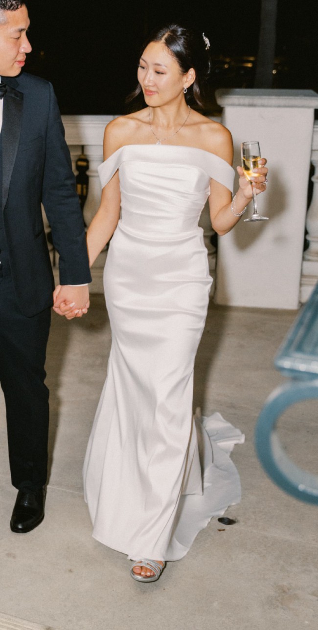 Step into a timeless, off the shoulder fitted gown that will make you feel like a trophy! It’s folded off the shoulder neckline and structured, ruched bodice are designed to flatter. There is a built-in corset that will guarantee there are no wardrobe malfunctions! As a playful twist, there’s a removable large bow. And beautiful beads trail down the center of the back for a stunning accent. This dress paired with an extra long veil (not included) will be a sight to never forget! (For reference, I am 5’5 and 110 lb.)
