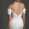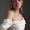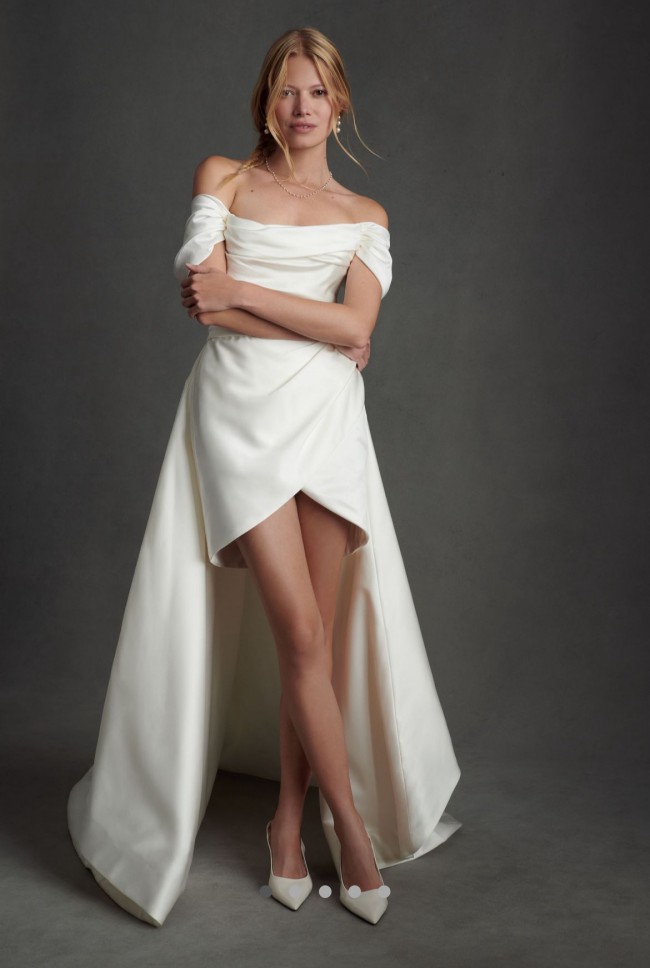 The Watters Marlina Mini Wedding Dress offers two show-stopping bridal looks in one. Featuring a removable skirt, this off-the-shoulder style is as dramatic as it is elegant, with a tulip hem, pleated details, and faux wrap front
