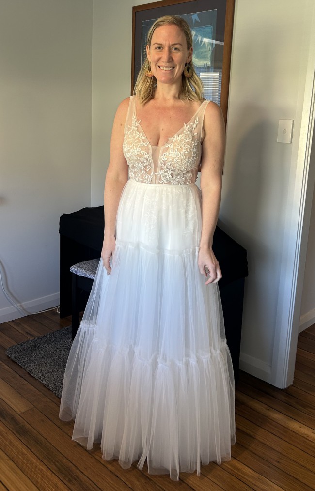 Would fit a size 12/small 14. Comes with dress bag. A very gorgeous dress but unfortunately due to illness the wedding was cancelled.