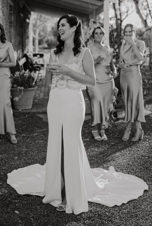 New design Anna Campbell Dylan Skirt with train and bustle, worn only for ceremony and photos. Very light wear marks on the hem, have to look closely to find them! Happy to send photos.