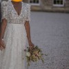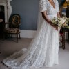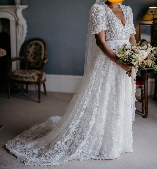 The Posy Gown features dreamy, embroidered lace and a subtle, sultry V neck with show-stopping voluminous short sleeves and a romantic A-line skirt and train.