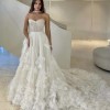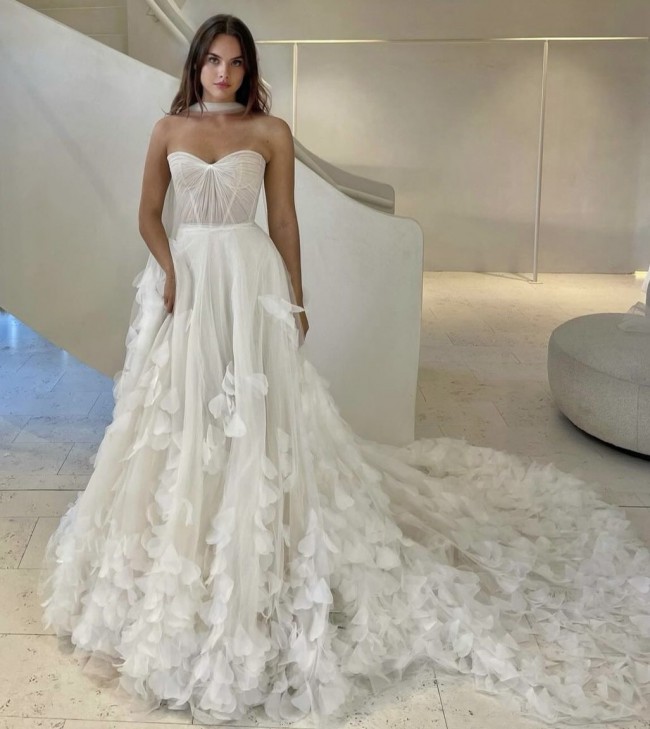 Introducing ‘Clover’ by Liz Martinez. A one-of-a-kind hand made couture gown that exudes romance. The delicate layering of sheer nude and ivory chiffon beautifully accentuates its intricate and timeless detailing. It showcases hand-sewn details, structured nude boning and an elongated train.