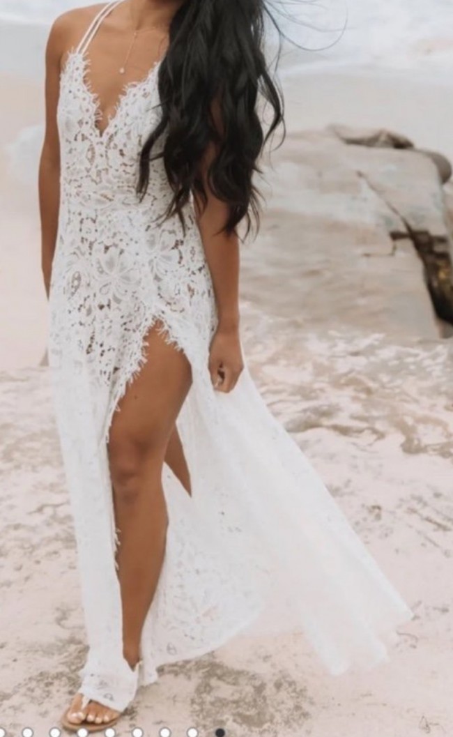 This is a stunning simple lace dress. it’s a gentle a-line, v neck has a thigh high slit that opens tastefully when you walk. It has a nude built in body suit. the dress is sheer but the lace ia thick and it’s subtle. it’s double strapped, crisscross open back.I’m 5 foot. It was definitely over a foot too long for me so will accommodate any height. it’s only been tried on. when I thought about keeping It,I was gonna do something with the crisscross back maybe add pearls or beading or something, but I just never got around to it. The tag is attached it’s called pink wish. This is not lulus. retail was $400.will fit a 4/6. the liner is a nude color stretchy. the fabric under the bust is fixed and the tightest part of the dress.