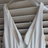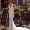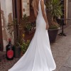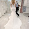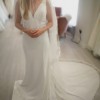 This fit and flare style wedding gown accentuates your figure beautifully and would also suit detachable sleeves. Dress contains cup support that can be removed if desired and is finished with a clean V-back with buttons to the end of the chapel length train.