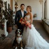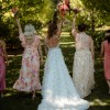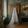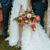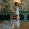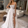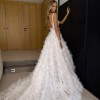 Designed to take their breath away dress with showing leg slit, made from glamorous and high – end material with hand – stitched 3D silk flowers. The modern line of the square neckline corset falls into thin straps and the whole is uniform with the skirt. The dazzling, open back turns into a long train which gives opulent finishing look. The dress seems heavy, but is very light and lavishly decorated. Has a nude body suit that you step into with beading/embellishments near the slit.