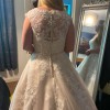 It is beautifully crafted with the most stunning detail - an illusion neckline / sweetheart bodice and lace applique tulle skirt over satin, with a soft touch of sparkles to the lace. The bodice has boning and a classy sparkle / pearl style belt built in. Has a gorgeous small train, that can be pinned up at the back (by buttons) to allow easier movement after the ceremony; was perfect for the first dance (and spin).