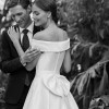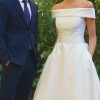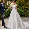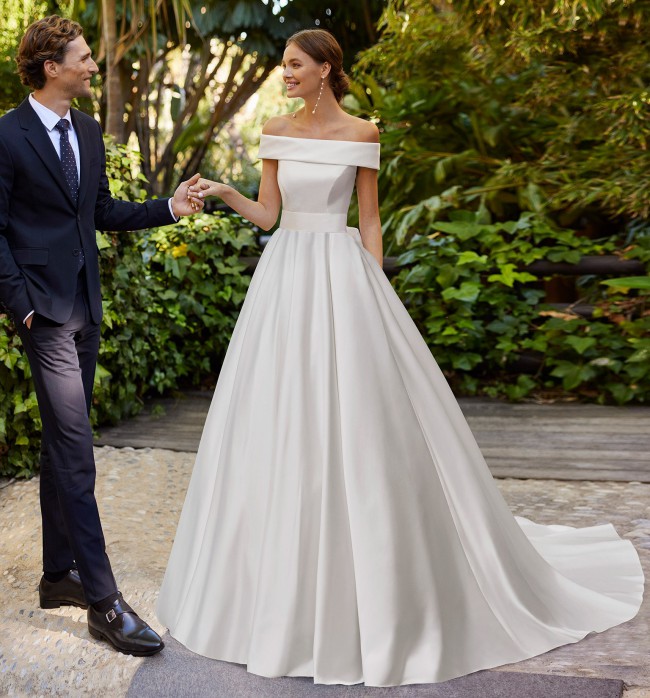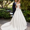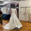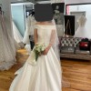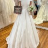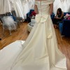 It is a classic A-line wedding dress, made of matte Mikado, with a full sheath-style skirt with pockets; with a bateau neckline and an open back with button detail and bow detail. Unique Adriana Alier design.