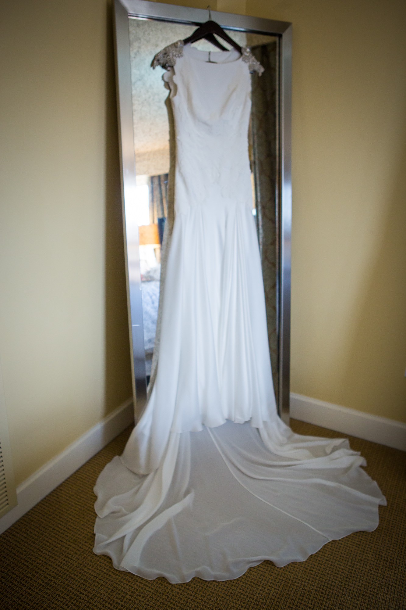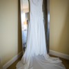 A flowing train completes the gown, adding a dramatic yet refined touch. The train drapes effortlessly, ideal for making a grand entrance.