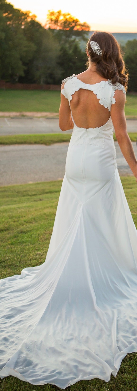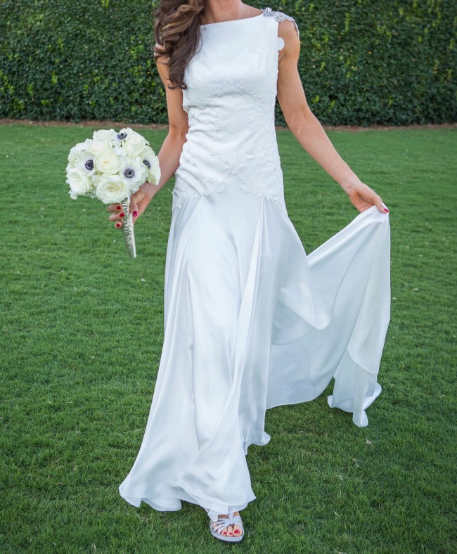 Elegant Carol Hannah Silk Wedding Gown with Appliqué Details and Train (2015 Collection)