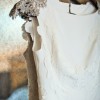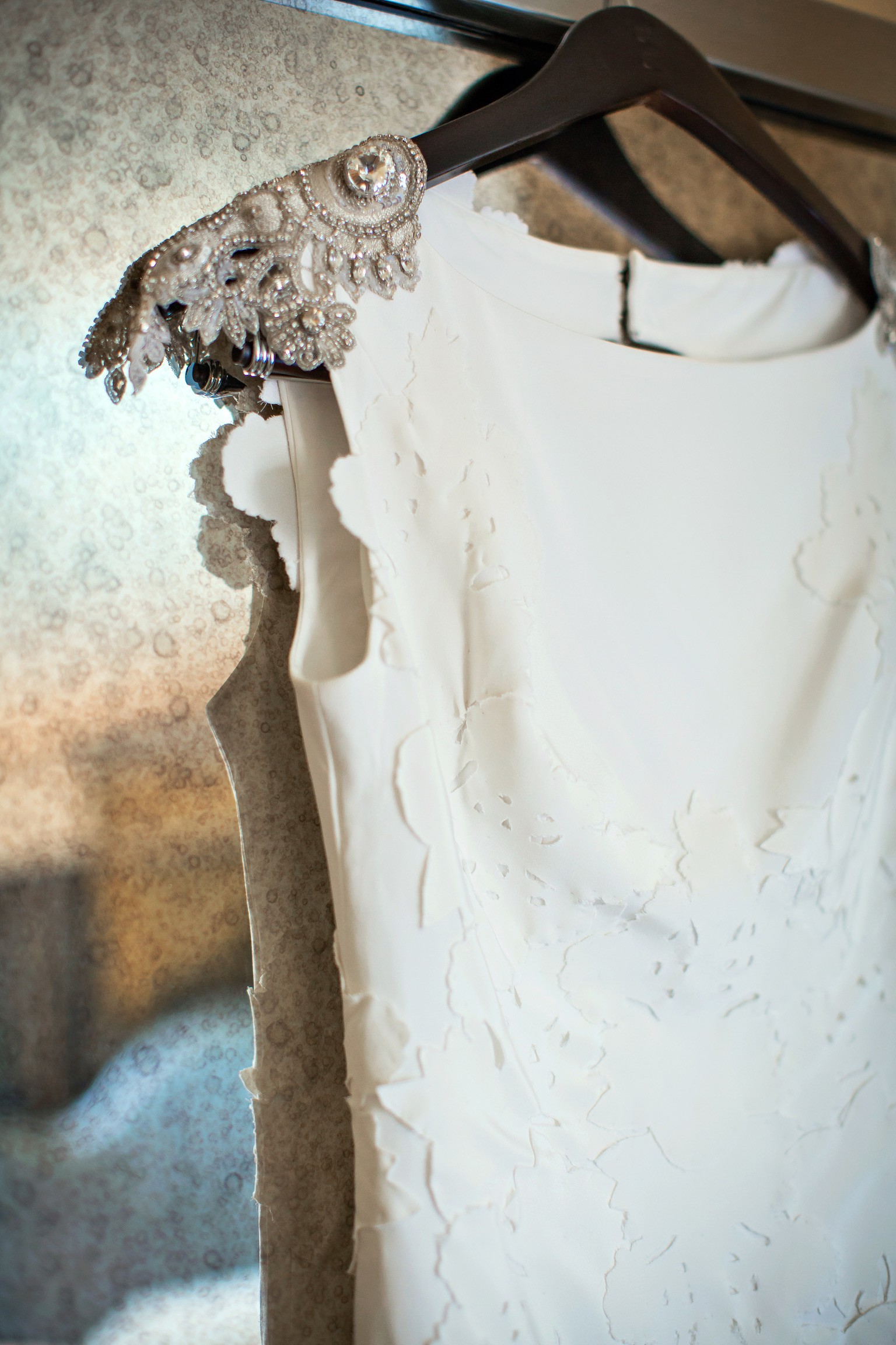 The gown’s shoulders are adorned with intricate, vintage-inspired beadwork and embellishments, adding a touch of glamour and sophistication. This unique detail enhances the neckline and frames the face beautifully.