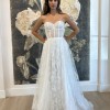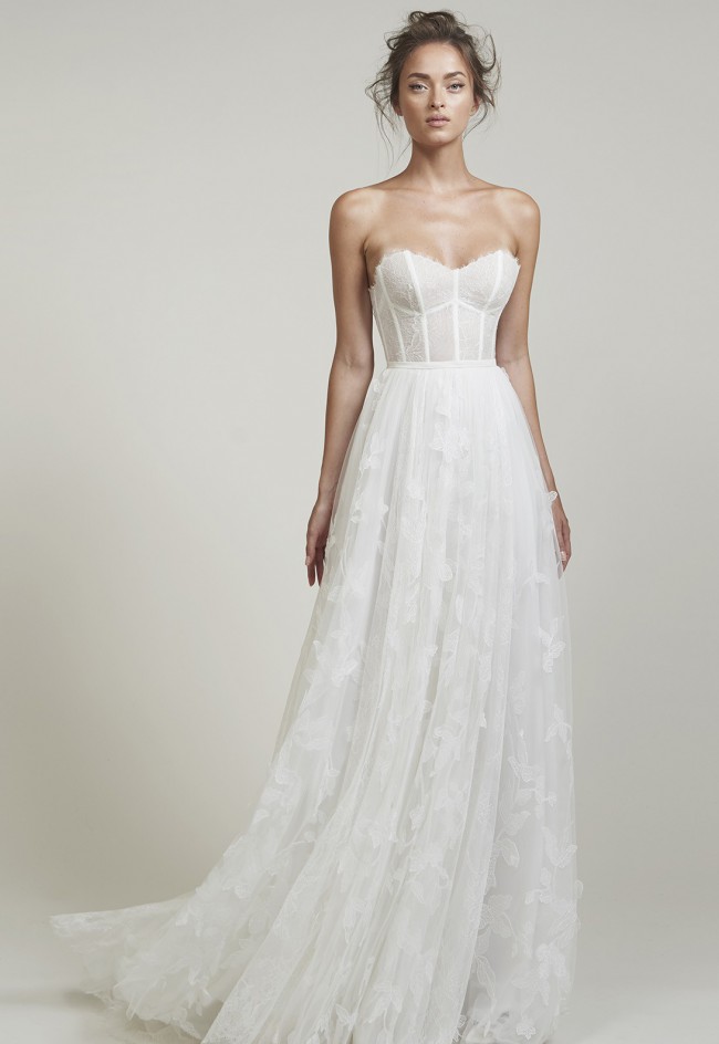 Strapless corset gown with tulle skirt and floral lace. Weightless and ethereal.