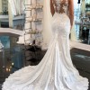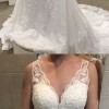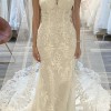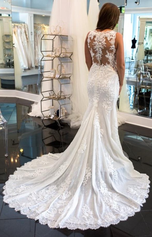 Traditional details with updated design elements create a uniquely sexy look on this Stella York wedding dress. Cotton-style vintage laces create a floral explosion throughout the fitted silhouette, and stand out against the neutral Georgette lining for a multi-dimensional look. A combination of French and eyelash laces finish the hem and neckline for a touch of old-world charm, while the V-neckline with wide lace straps feels casual yet classic. The back of this gown features an incredible floral lace design that complements the floating fabric buttons, and the delicate yet multi-layered train flows out from beneath the hips to create an enviably feminine shape.