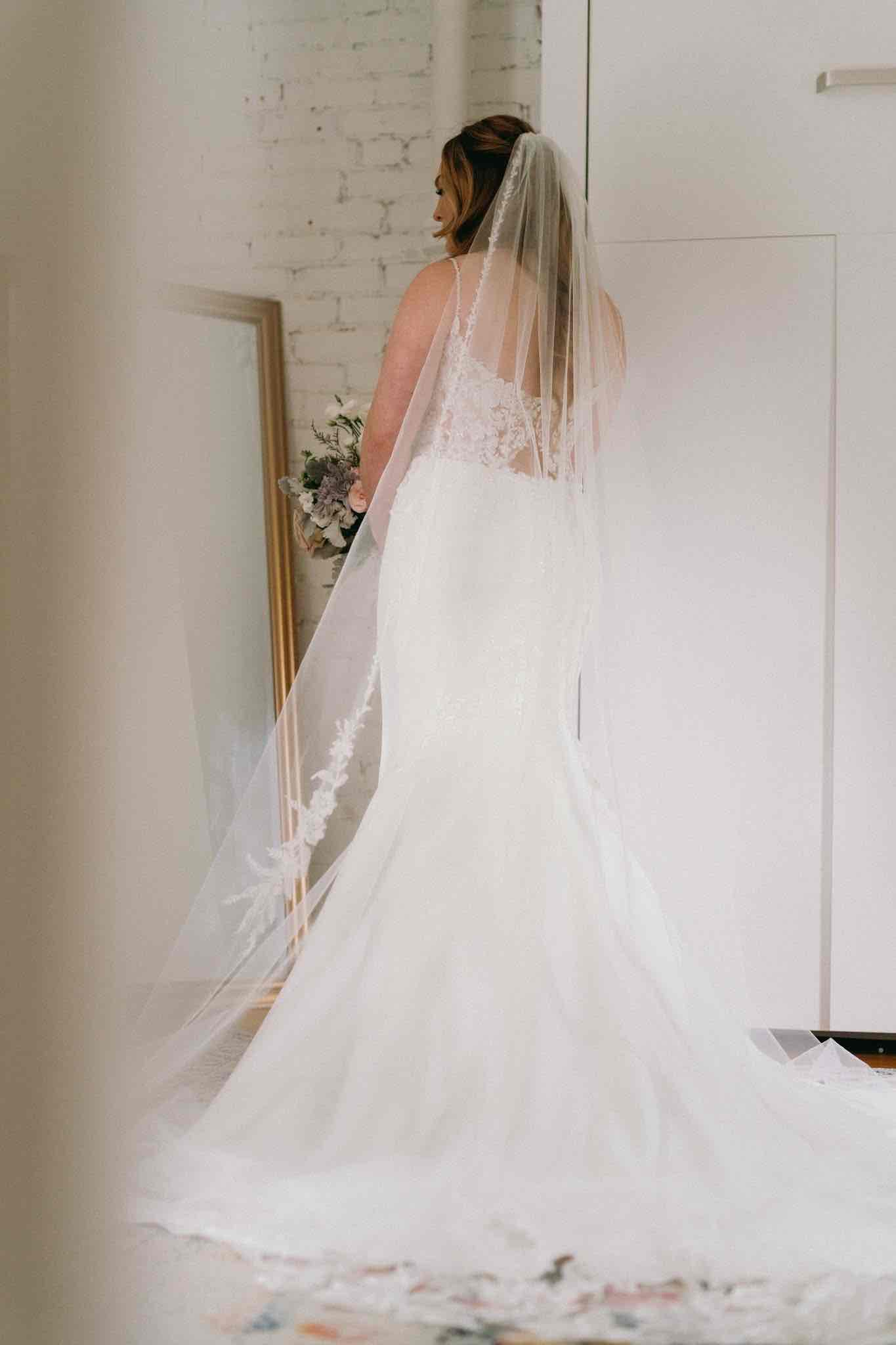 This gown combines elegance with modern details and was carefully chosen for its versatility and grace. The custom alterations allow for a second, effortlessly chic look when the bustle is lifted. Perfect for a bride who wants both a classic and contemporary