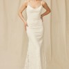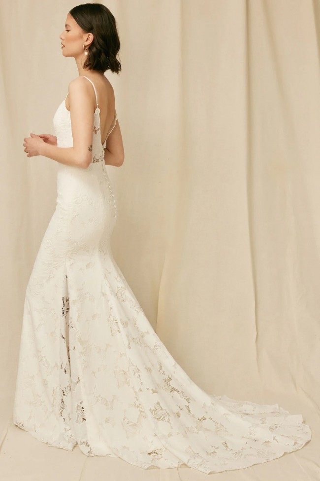 Charlie is ornate, luxurious, and all about contrast. From the top, botanical lace overlays Charlie’s recycled satin lining. But this reference to a well-loved bridal motif is offset by Charlie’s plunging lace-lined back and the lace godet which accents the modern mermaid skirt. These unexpected elements make Charlie a gown full of mystery and delight, just like you.
