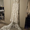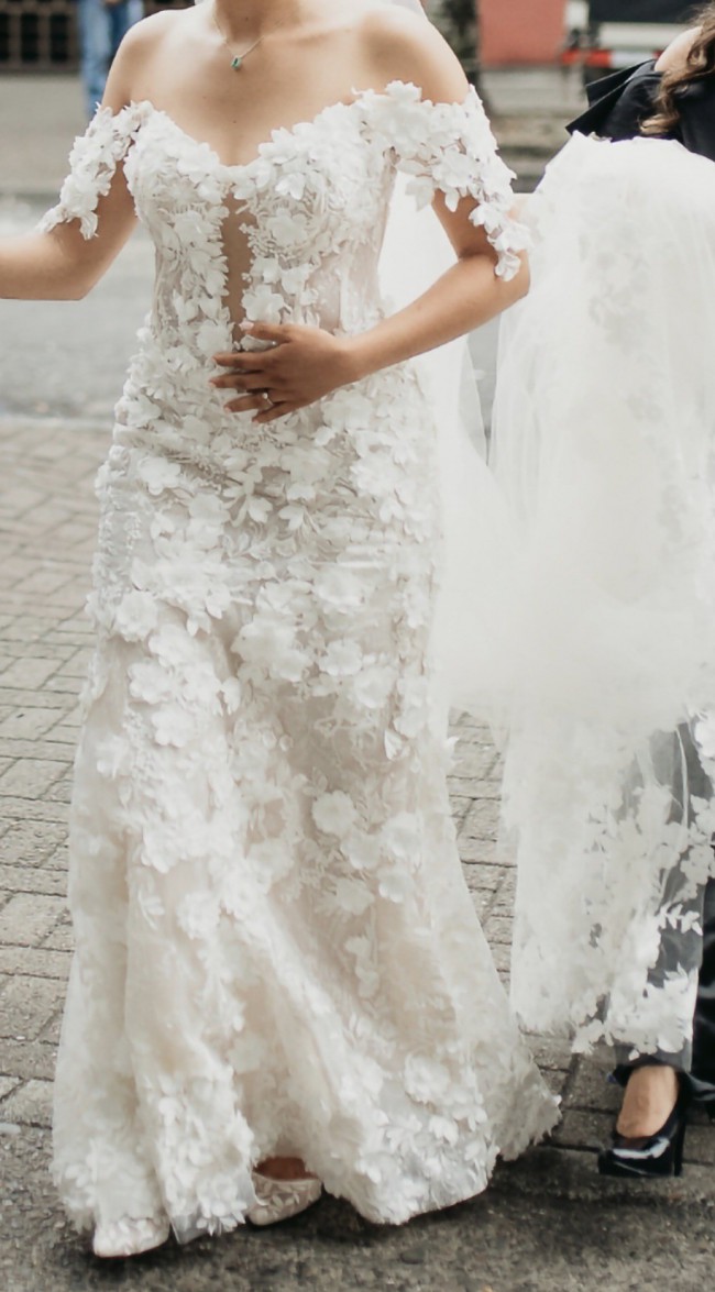 This dress is extremely flattering! It hugs you in all the right places and provides support from top to bottom. I normally wear a US size 6 or Medium, but the label on this dress says size 10. I also bought the version of this dress that is lined (directly with the designer), since I wore it to church and the version that has a panel to cover the high-slit. I will also include the cathedral veil that I purchased from a different designer (look at pics) that match the dress - unfortunately there is a slight rip on it so you will have to probably get your seamstress to apply a similar lace pattern on it (still I paid around $650 for the veil and you'll get it included with the dress). Also both the dress and the veil are dry-cleaned.