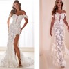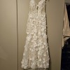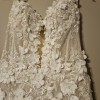 The official website description for the dress is: "Sleeveless tulle and Schiffli lace appliqué fit and flare bridal gown features beaded Schiffli lace appliques, 3D flowers, dress with plunging V-Necklineline, corseted bodice, draped flower and lace cap sleeve, sparkle illusion, dramatic high leg slit, chapel train"