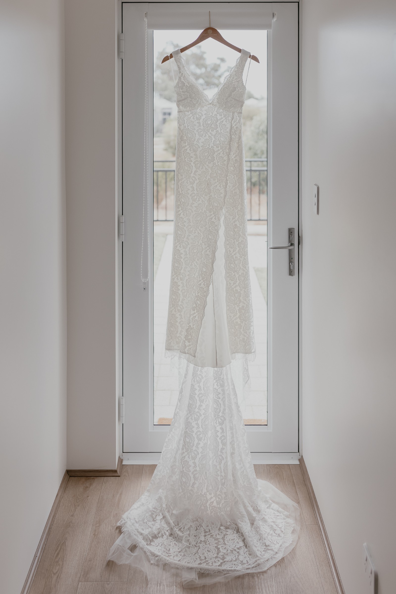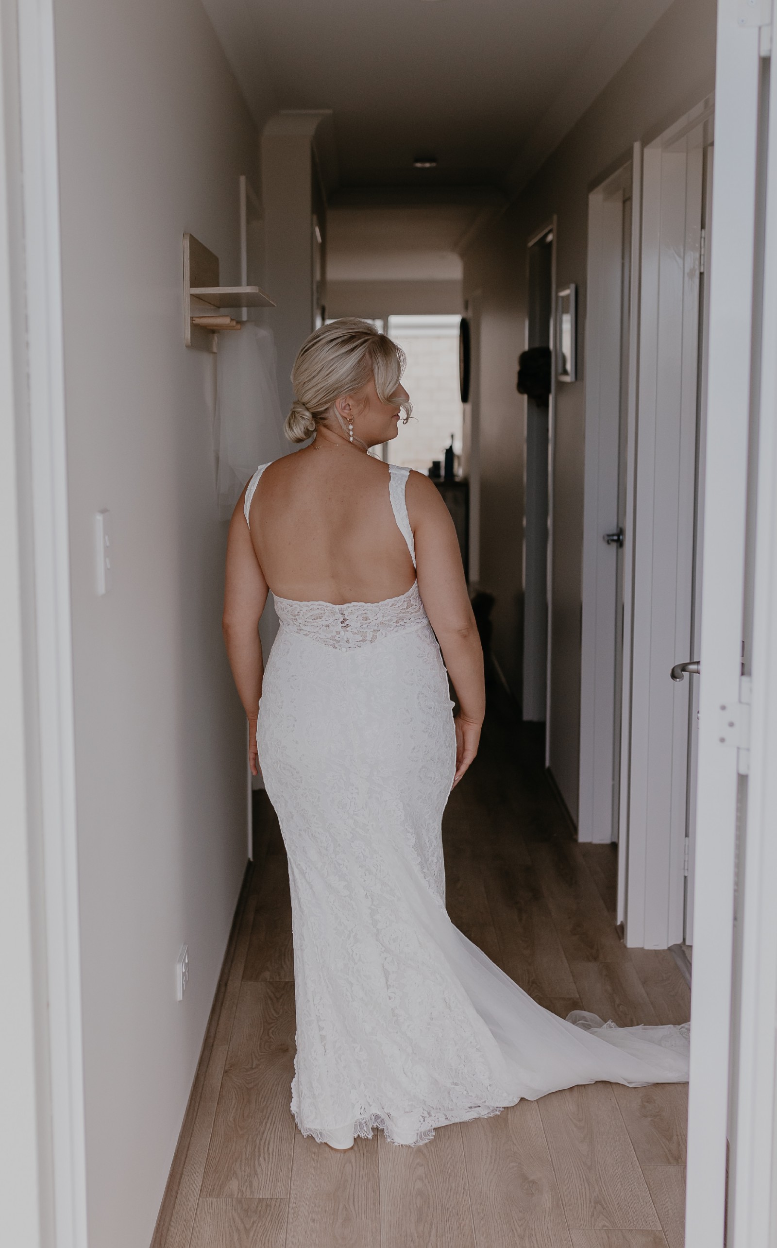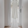 80cm train features a concealed loop up from the centre back hem to form the bustle. The finger loop is located on the underside of the bustle loop.