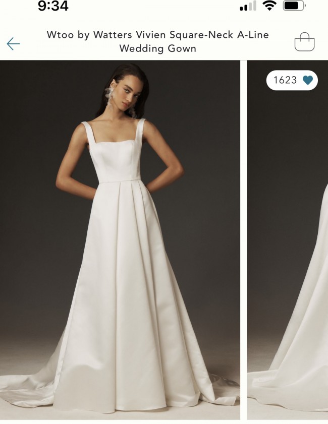 Brand new dress, never worn, still has authentic tags. No alterations. Pearly white material, square neck, train.