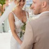 This stunning, sexy stretch georgette mermaid wedding dress has twinkling beaded floral lace, baroque lace and sparkling Chantilly lace on the classic illusion bodice leading down to the beautiful side cut-outs trickling down to a sultry skirt with a signature ÉLYSÉE cut-out train with sculpted hem.