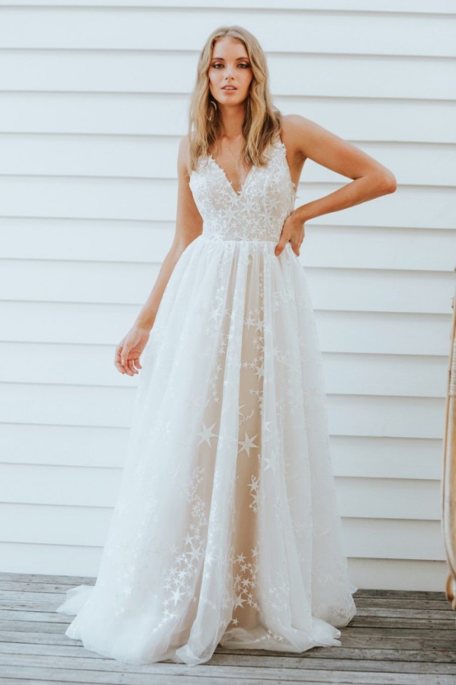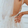 I fell for another dress that's better suited to my venue and now I’m selling my beautiful, celestial AMALFI gown. Originally bought as a floor sample with no visible wear and tear. The dress features stunning hand-sewn star-patterned tulle from top to train, that truly makes you feel like you’re seeing stars! V-neckline bodice and fully pleated, jersey-knit skirt is so soft and comfortable. I'm including the double layer gold star veils; can be worn separately or together. The only thing I planned to alter was the height, otherwise it fit me perfectly (typically wear a size 10, 36C bust, 5' 3" tall; My Bridal Measurements: Bust: 37, Waist: 31, Hips: 41)