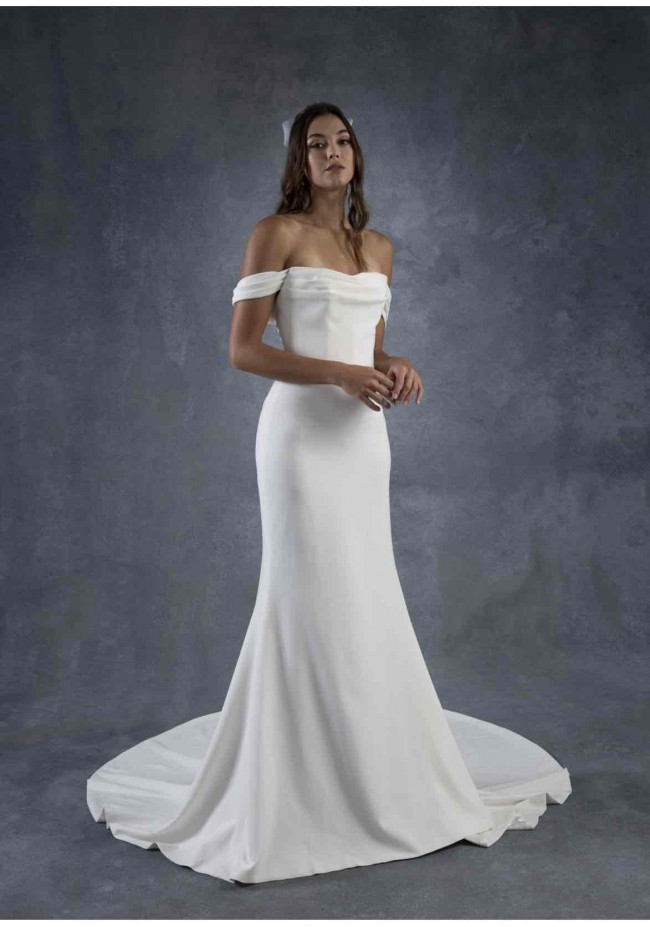 Beautiful ivory crepe gown that shapes your body so well. I loved it so much for my wedding. It was very comfortable to wear the entire day. The off the shoulder sleeves are detachable, which made the dress easy to dance in. It has been professionally dry cleaned. It is in good condition with some minor marks and spots at the bottom of the gown (shown in photo) from brushing against the ground while walking in it. From the Tara Lauren website for the Laguna dress: Cowl neck stretch crepe gown with inner boned bodice structure. Removable off shoulder sleeves.