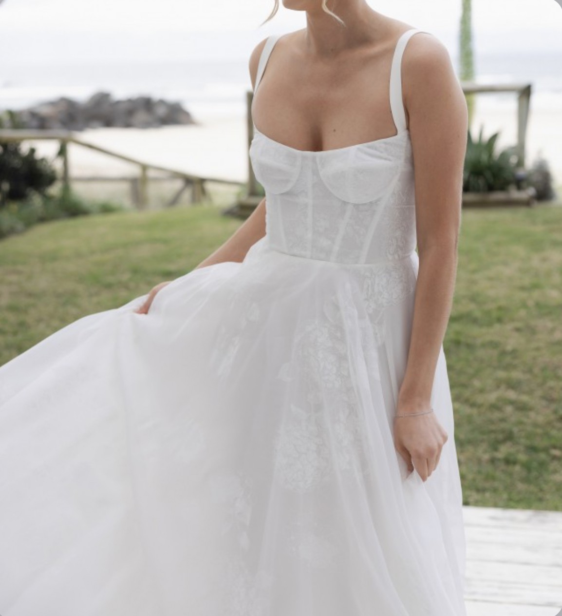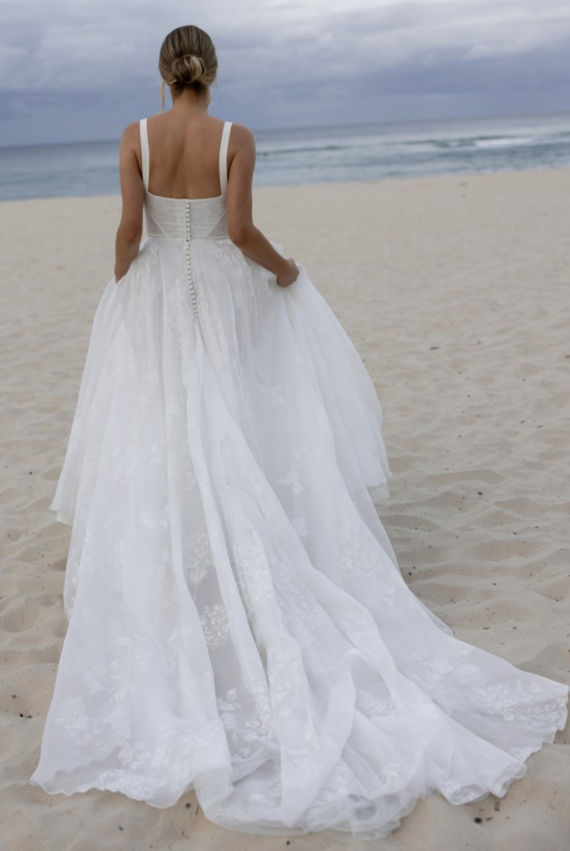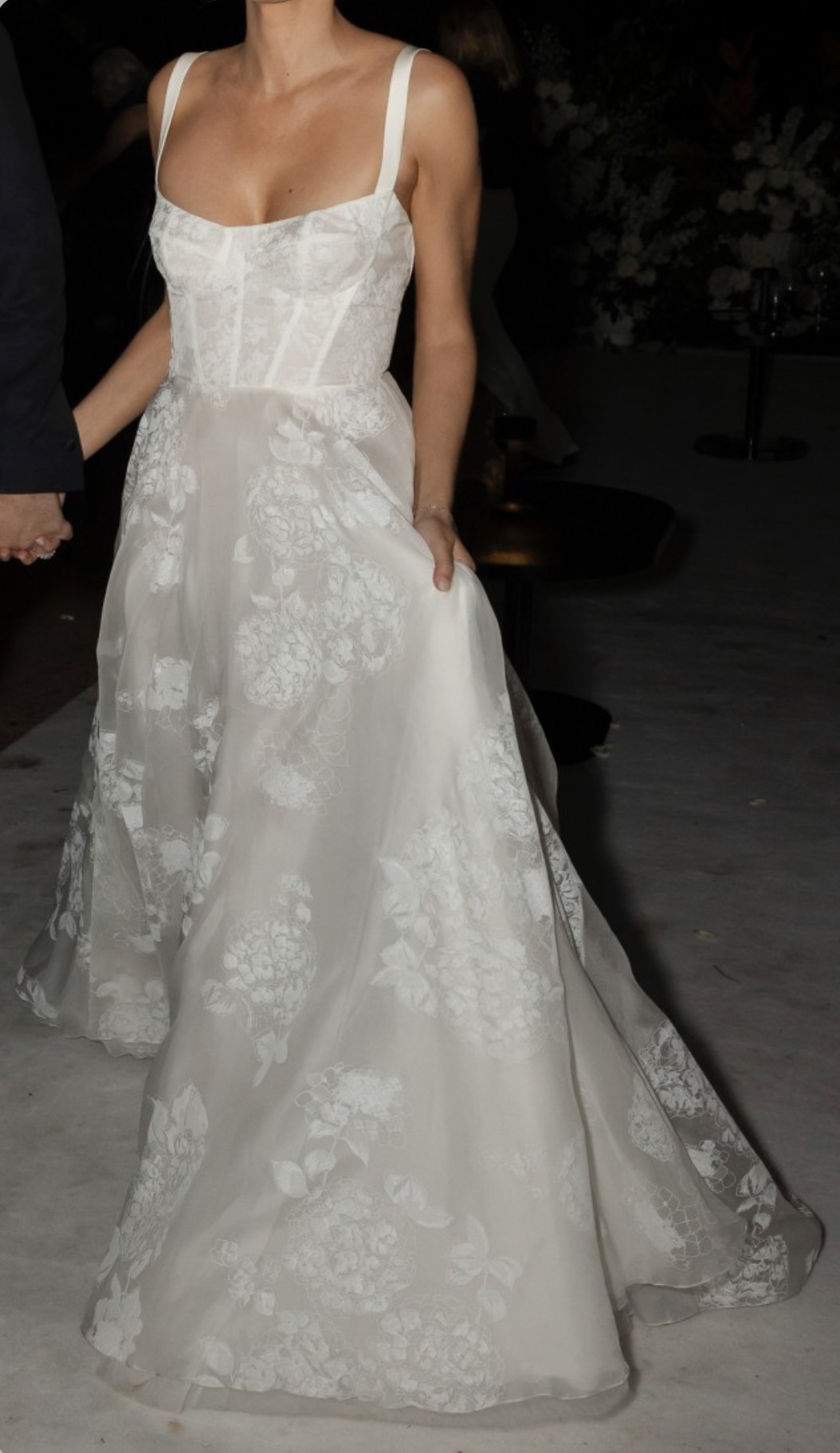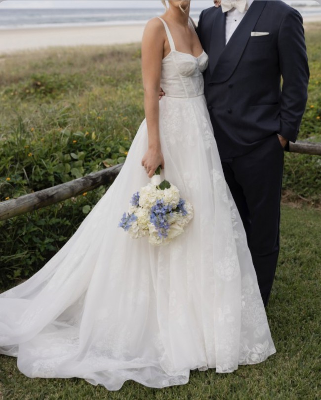The most beautiful wedding dress! The material is so light-weight (there is a lining but just enough to ensure it’s not too sheer) and although it is beautifully fitted around the bust and bodice, it was incredibly comfortable to wear. The style of the dress is “Love in Portofino” from J Andreatta but using a different print - it is of hydrangeas and at the time of designing, it was the only one created in this way! The print adds a level of dimension to the dress (which you can see more clearly in the photo taken at night) than it being a lace or embroidery. There is also a bustle at the back (at the bottom of the buttons) so the train can be attached. One of the straps came away at the seam very slightly but this has been professionally fixed so it’s in excellent condition (now dry-cleaned and boxed). I hope someone else can experience this magnificent dress on their wedding day!