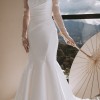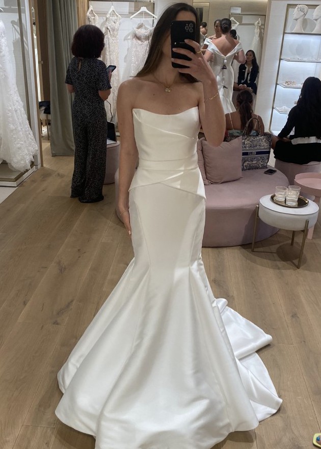 Vera Wang Lucille Wedding Dress – Off White Silk Mikado, mermaid style dress with modern sweetheart neckline, criss cross bodice and pleats on skirt.