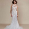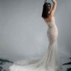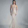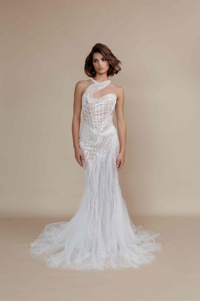 A wedding dress of fitted silhouette. Semi-transparent corset with contrasting scallops on top is asymmetrically covered with pearl-embroidered lace. The silhouette skirt is decorated with wedges of fine mesh and has a train. There are also flesh-colored shorts under the transparent skirt included in the price. Please note that gloves are not included.