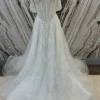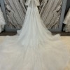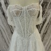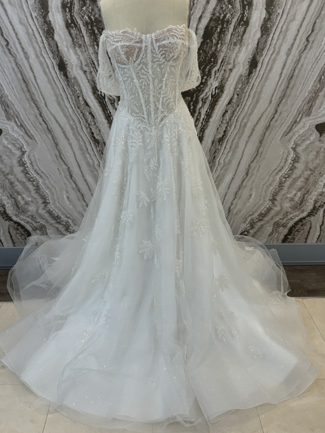 Novelty crystal beaded lace with glitter tulle underlay. Modified A-line skirt. Light weight construction. Detachable off-shoulder sleeves. Chapel train.
