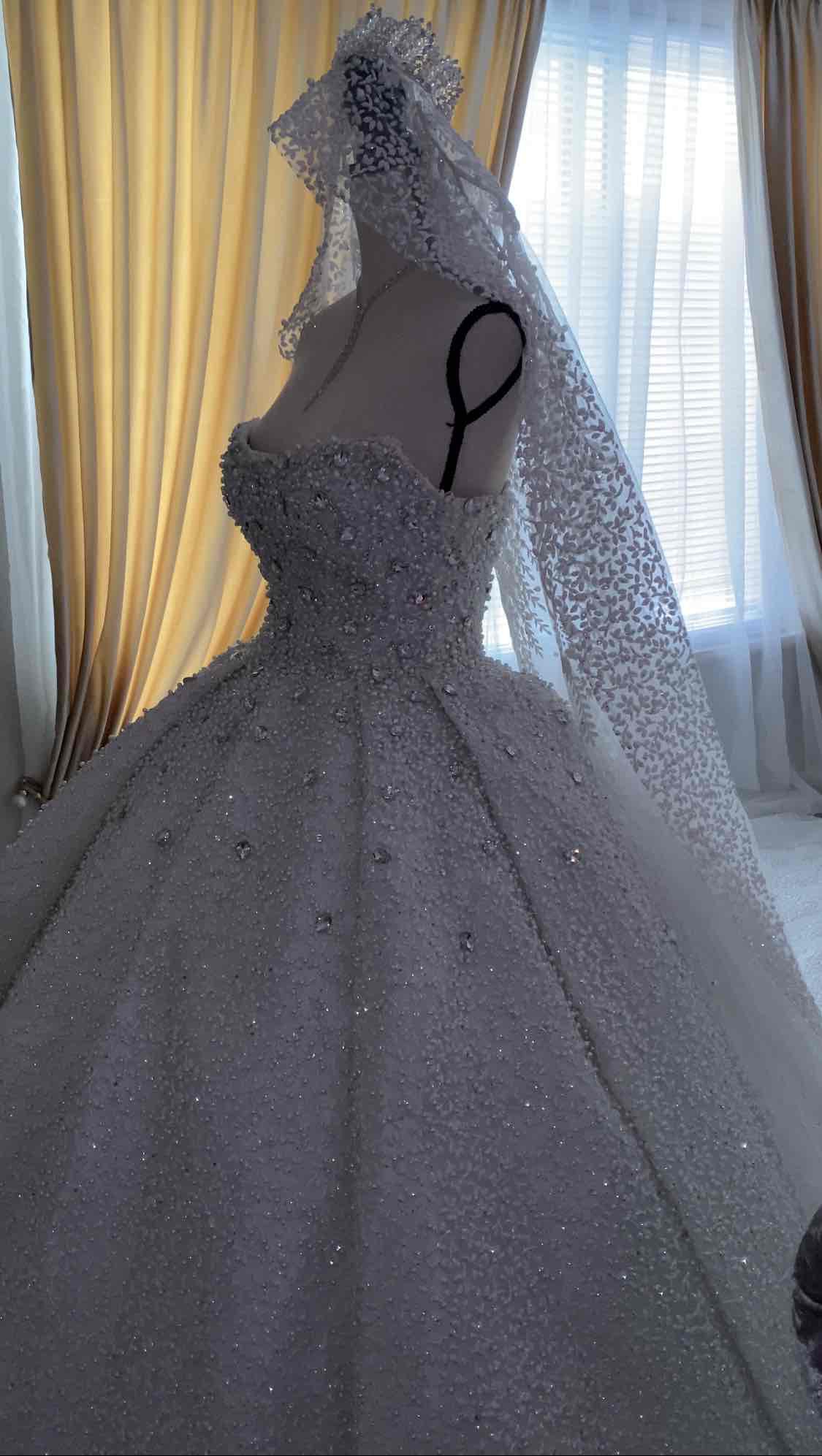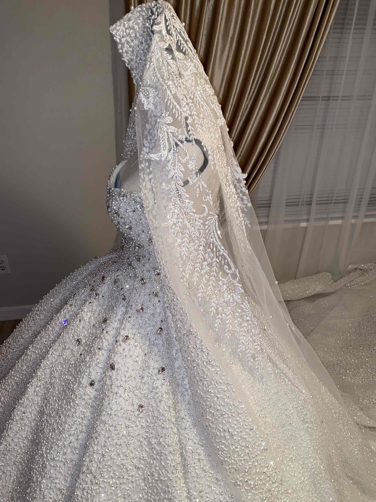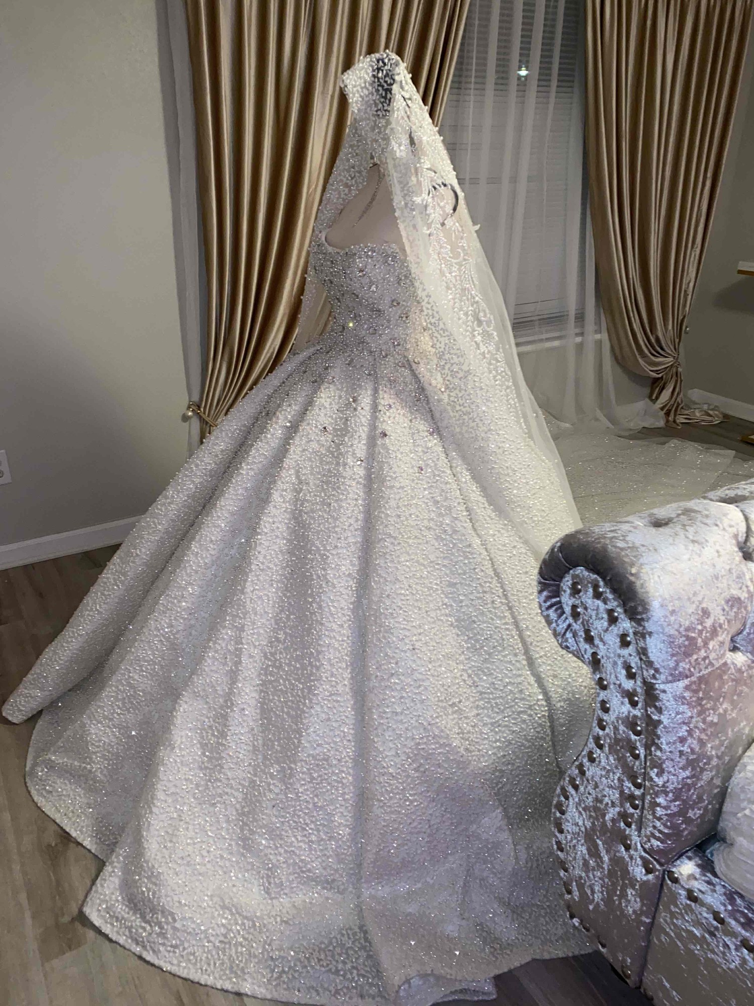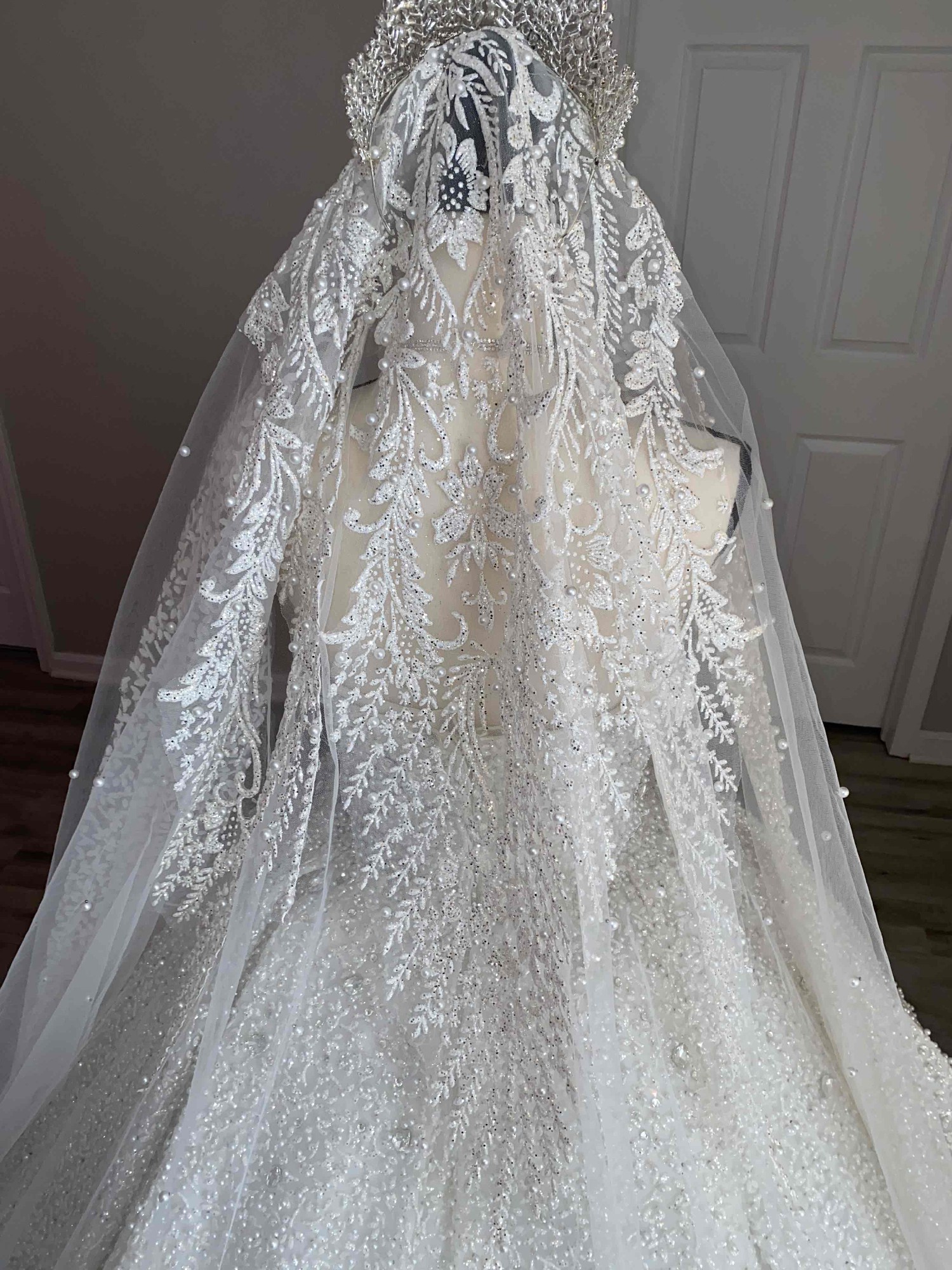 This stunning, custom-made ball gown and veil is in pristine condition and has never been altered. The gown features exquisite craftsmanship, with intricate detailing designed to make any bride feel like royalty. The veil complements the gown perfectly, adding a touch of elegance and romance. A truly one-of-a-kind piece that ensures you’ll be the center of attention on your special day.