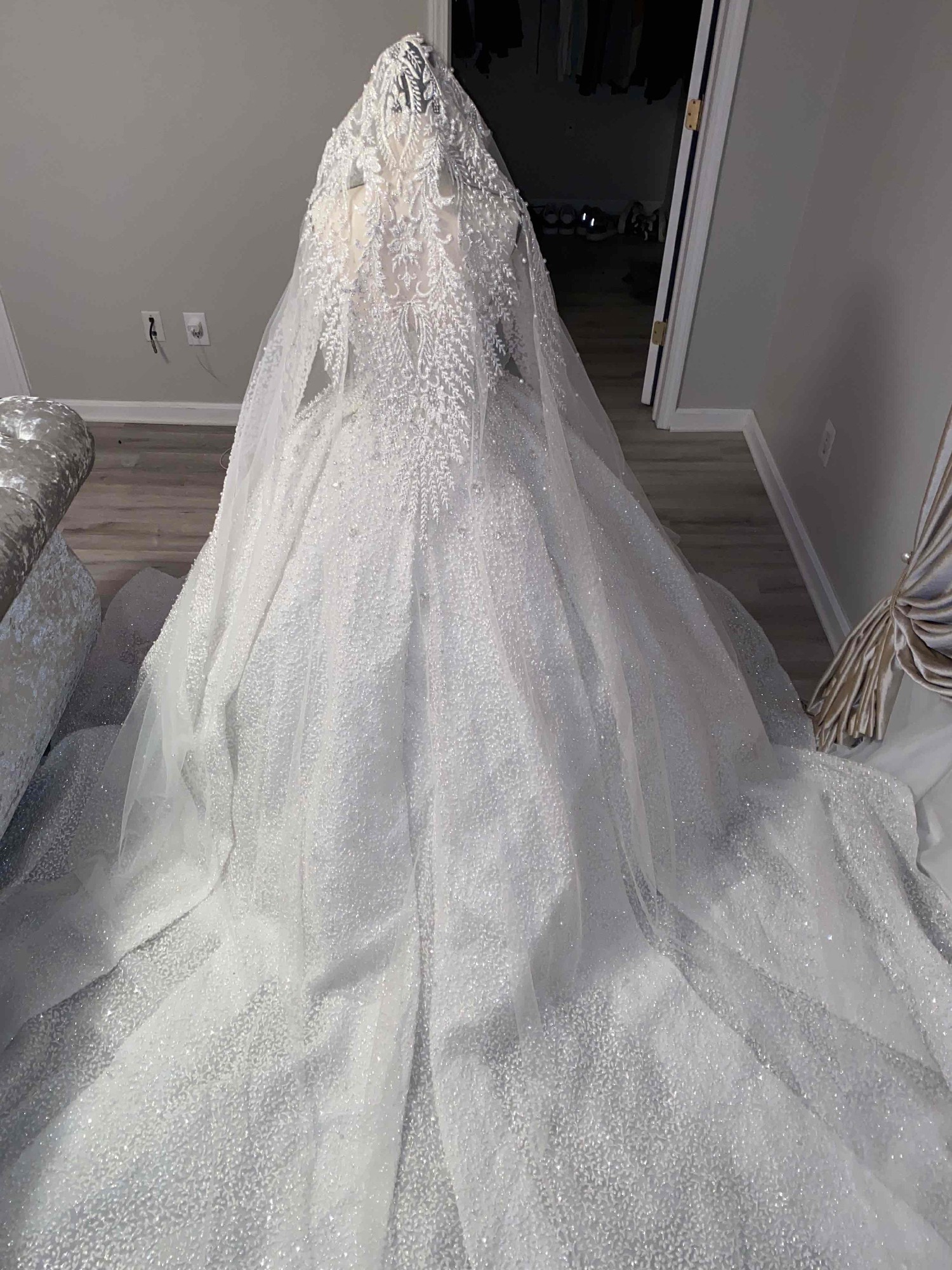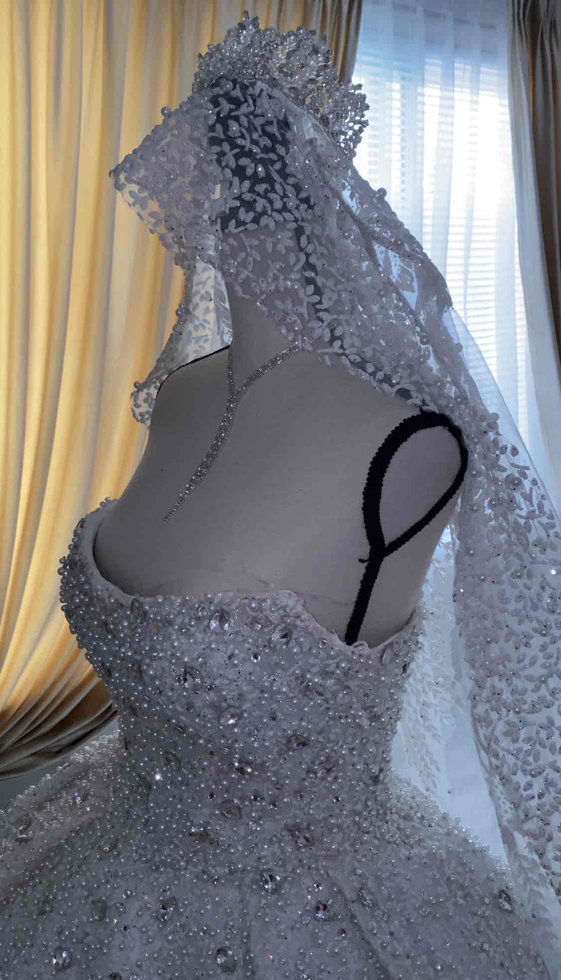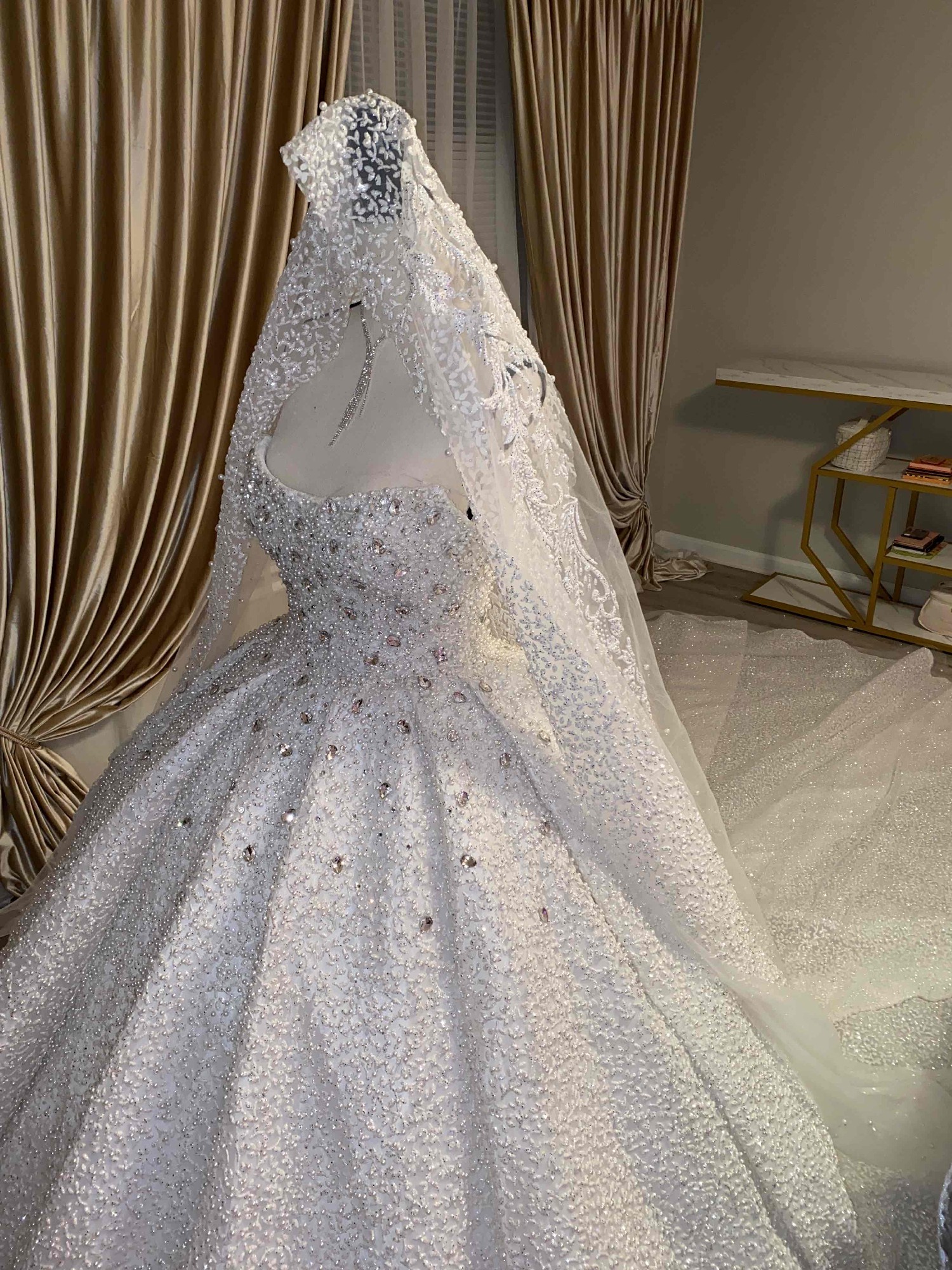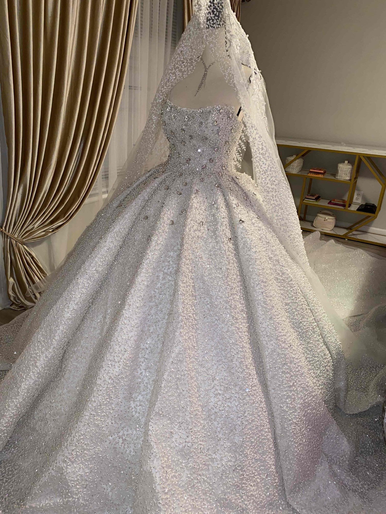 This stunning, custom-made ball gown and veil is in pristine condition and has never been altered. The gown features exquisite craftsmanship, with intricate detailing designed to make any bride feel like royalty. The veil complements the gown perfectly, adding a touch of elegance and romance. A truly one-of-a-kind piece that ensures you’ll be the center of attention on your special day.