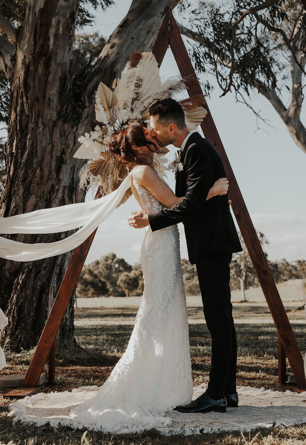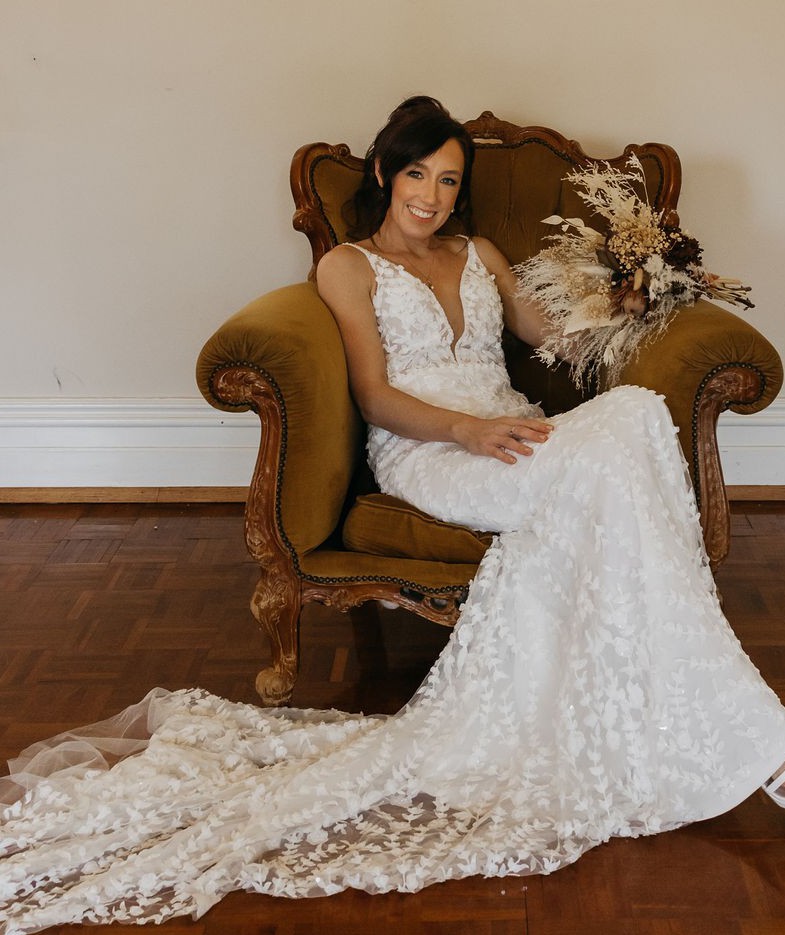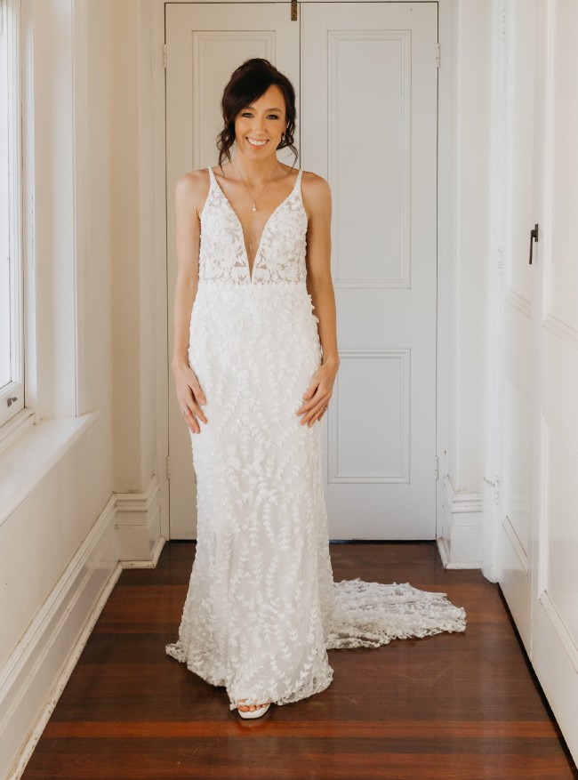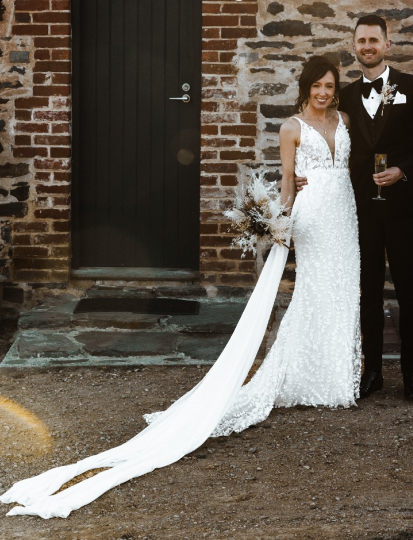 This dress is so versatile and works well for so many wedding styles. A light dress which was a dream to wear all day and had flexibility to dance the night away with ease. Has bustle and wrist strap.
