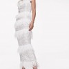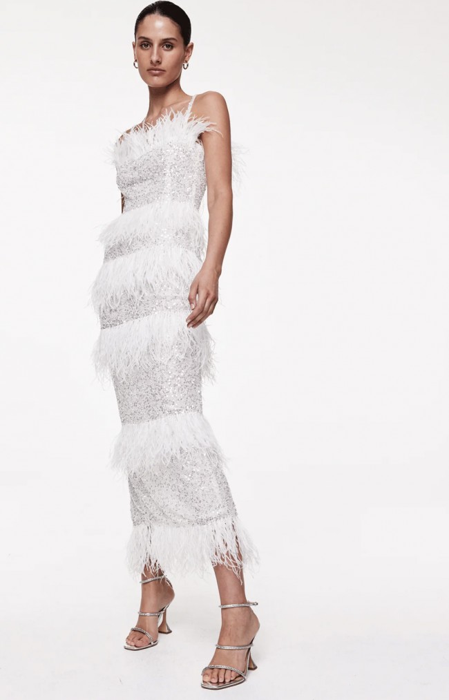 A standout silhouette, the Frenchy Dress boasts signature Rachel Gilbert detail, featuring hand embellishment complete with layer feather panels throughout. This is a slim-fitting silhouette, designed to hug the natural curves of the female form complete with a flattering square neckline.