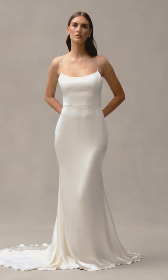 Gorgeous and classic silk satin dress. New, never worn, only tried on. When I was trying on dresses, this made me feel the most beautiful. We changed the theme of the wedding, so I am trying to find something that suits it more. The second picture is of me when I tried it on. I don’t do it justice, so I added pictures of other brides wearing it as well.