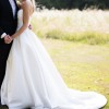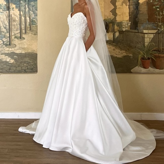 The bottom of the dress is Elegance (Classics collection) - dramatic full silk skirt with pockets and train. Comes with a removable velcro petticoat (I wore it during the ceremony and removed it for dinner/party).
