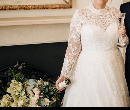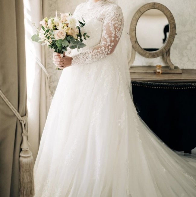 Amalthea is a statement lace high neck a line with sleeves. Still currently on the wed to be website.
