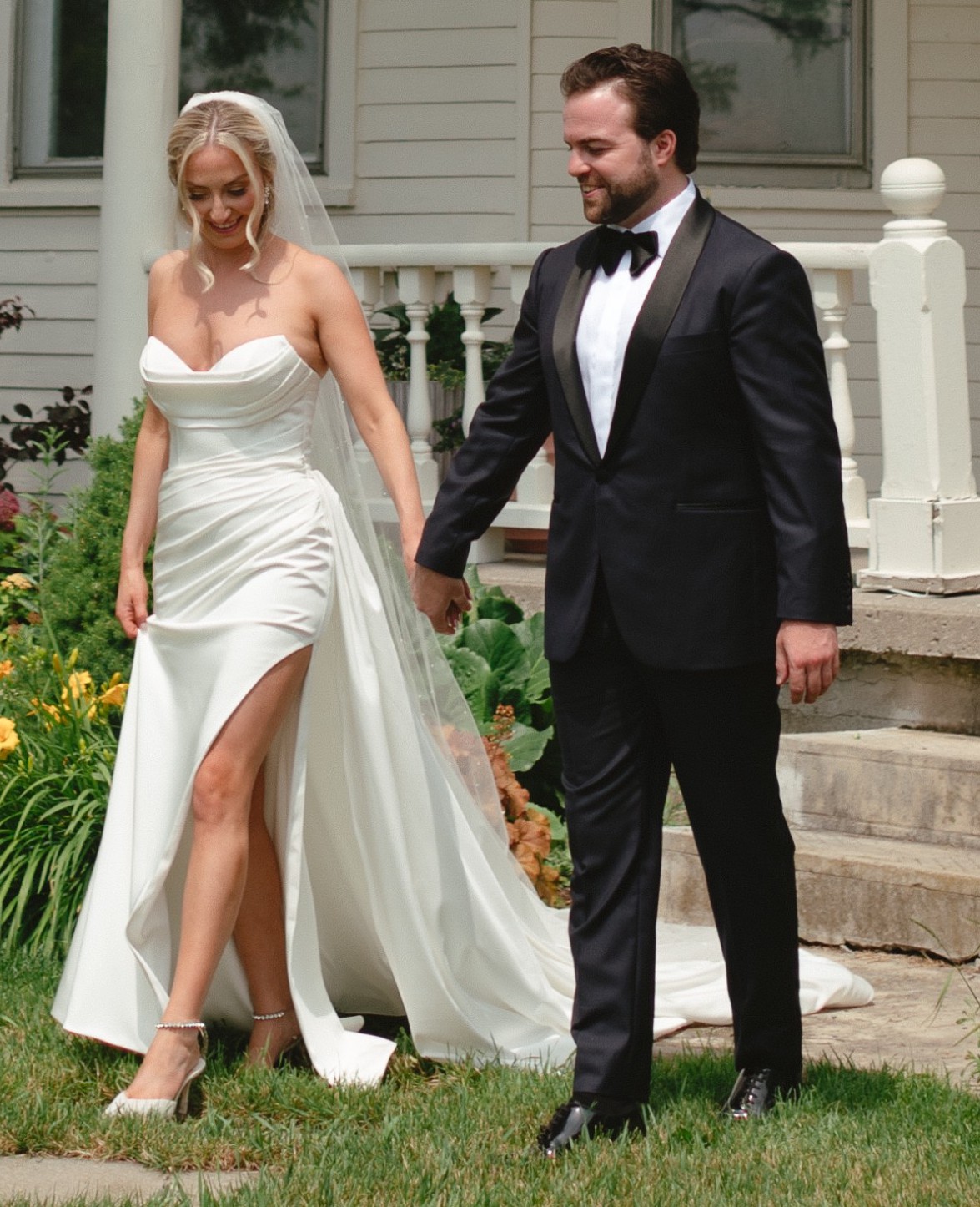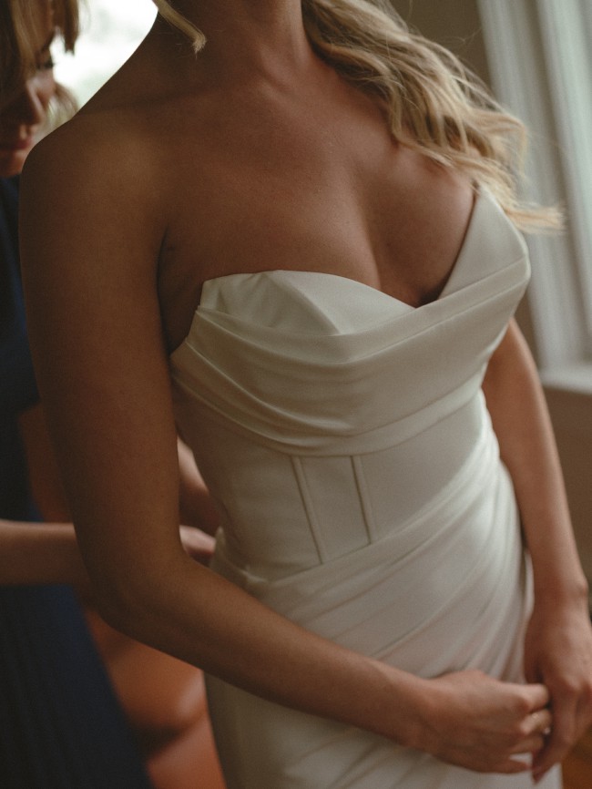 It’s Huntleigh’s world and we’re just living in it! Jane Hill’s best seller for a reason, the Huntleigh gown encapsulates modern elegance and exudes sophistication. With her sweetheart detailed neckline, signature under bust detailing and beautiful draping the Huntleigh gown is perfect for any bride. The detachable train creates a perfect ceremony to reception look and covered buttons complete the back train detailing, paired with her thigh high split. She is the moment. She is Huntleigh.