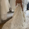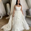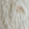 “A full floral fantasy, Kristiane is crafted in layers of soft netting. The bodice is a fully constructed corset for that nipped-in waist look, her dramatic skirt is not short on drama with rosettes, and layers of cascading ruffles.”