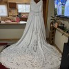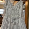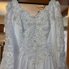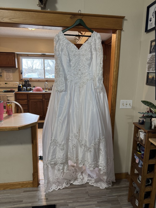 Was my mom’s wedding dress when she got married in 2000. Alfred Angelo is the designer. It does not have a size tag on it but we are guessing that it is a 24-26 as my mom was a size 20-22 in street sizing when she got married. It has been dry cleaned and stored in wedding dress bags since her wedding day. It also comes with an additional crinoline. The dress itself has some fabric built in to give that poof but like I said above, it comes with an additional one. It’s in great condition. I do have dogs so potential for some dog hair on the train since I took it out to take pictures. I also have the shoes she wore. They are a size 9ish (they also don’t have a size on them), and those will also come with the dress. Feel free to reach out with any questions. And I can send additional pictures if need be but I can only upload 4 here.