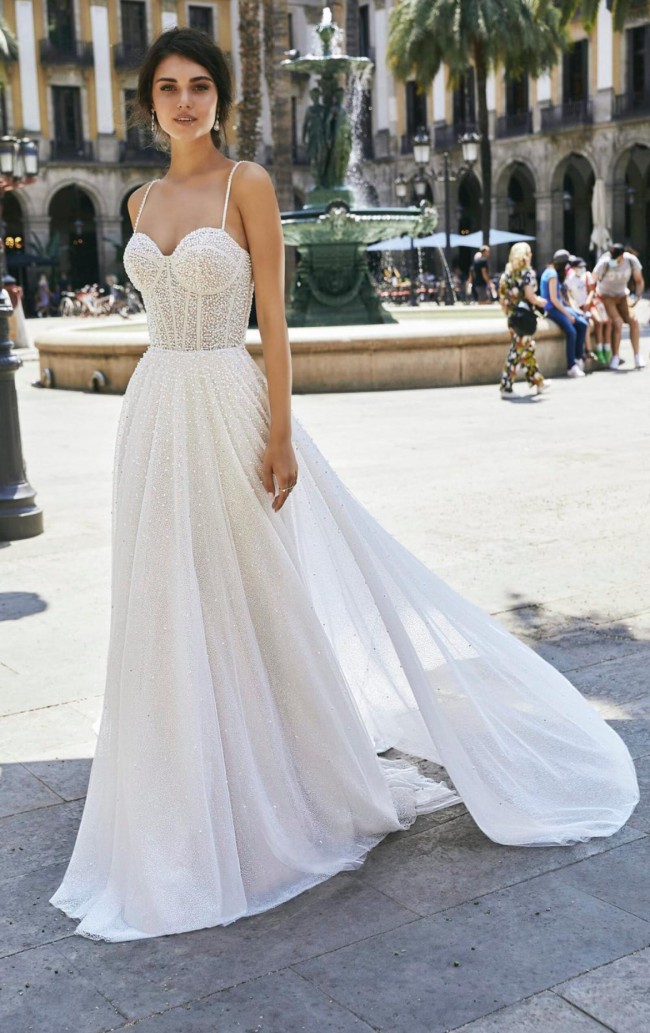 Brand new with labels on Brought August, receipt available. It’s beautiful a truly stunning dress. It’s covered in pearls beads and sequins. It’s fit and flare with glitter tulle. This striking gown has an open back, sweetheart neckline with delicate straps. The back has beautiful bridal button fastening leading to the waist. I brought it with the over skirt so I could change my look into the evening.