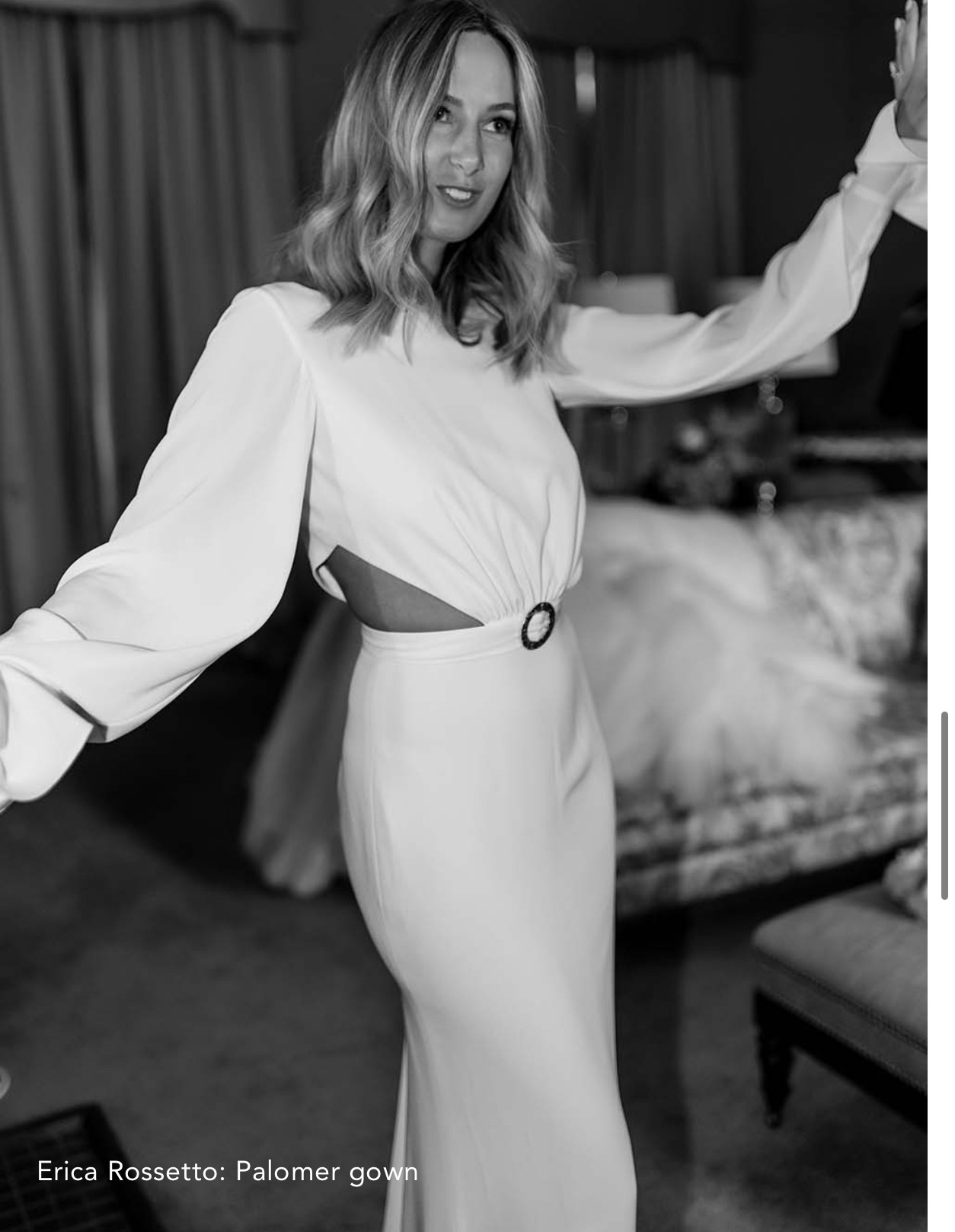 Long draped sleeves with extended cuff, finished with matching Italian buttons.