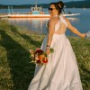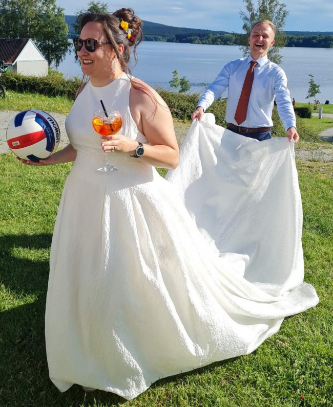 When I tried on this stunning gown, I knew it was the one. It checks all the boxes: a beautifully unique back design, a discreet décolletage, and a luxurious fabric that resembles brocade but is incredibly lightweight. I wore it on a warm summer day and felt comfortable and free all day long.